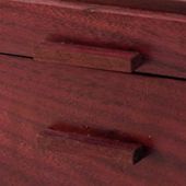 The sides of the box are made from a single board with waterfall mitre joints. That allows the natural pattern of the wood grain to flow all the way around the box. Grain is matched on three corners. Purpleheart drawer pulls. Mitred corners reinforced with Purpleheart keys. Sides are solid 1/2" (13 mm) thick Purpleheart