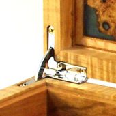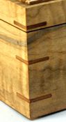 The sides of the box are made from a single board with waterfall mitre joints. That allows the natural pattern of the wood grain to flow all the way around the box. Grain is matched on three corners. Mitred corners reinforced with Curly Maple keys. Sides are solid 1/2" (13 mm) thick Curly Ambrosia Maple