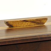 Decorative Zebrawood handle on top. Tapered Zebrawood legs. Sides are 3/8 " (9.5 mm) thick Dark Roasted Curly Maple. Top is made from laminated pieces of Dark Roasted Curly Maple, Roasted Bird's Eye Maple and Zebrawood, about 1/2" (13 mm) thick. |