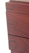 The sides of the box are made from a single board with waterfall mitre joints. That allows the natural pattern of the wood grain to flow all the way around the box. Grain is matched on three corners. Purpleheart drawer pulls. Mitred corners reinforced with Purpleheart keys. Sides are solid 1/2" (13 mm) thick Purpleheart