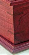 This urn is made from Purpleheart, a premium hardwood native to Central and South America. It is a dense and durable hardwood known for its striking purple coloration, which darkens to a deeper violet-brown over time. The bookmarked centre panel on the top is framed with bands of Purpleheart, separated and defined by Maple veneer.