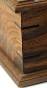 The sides are made from a single board with waterfall mitre joints. That allows the natural pattern of the wood grain to flow all the way around the urn. Grain is matched on three corners.